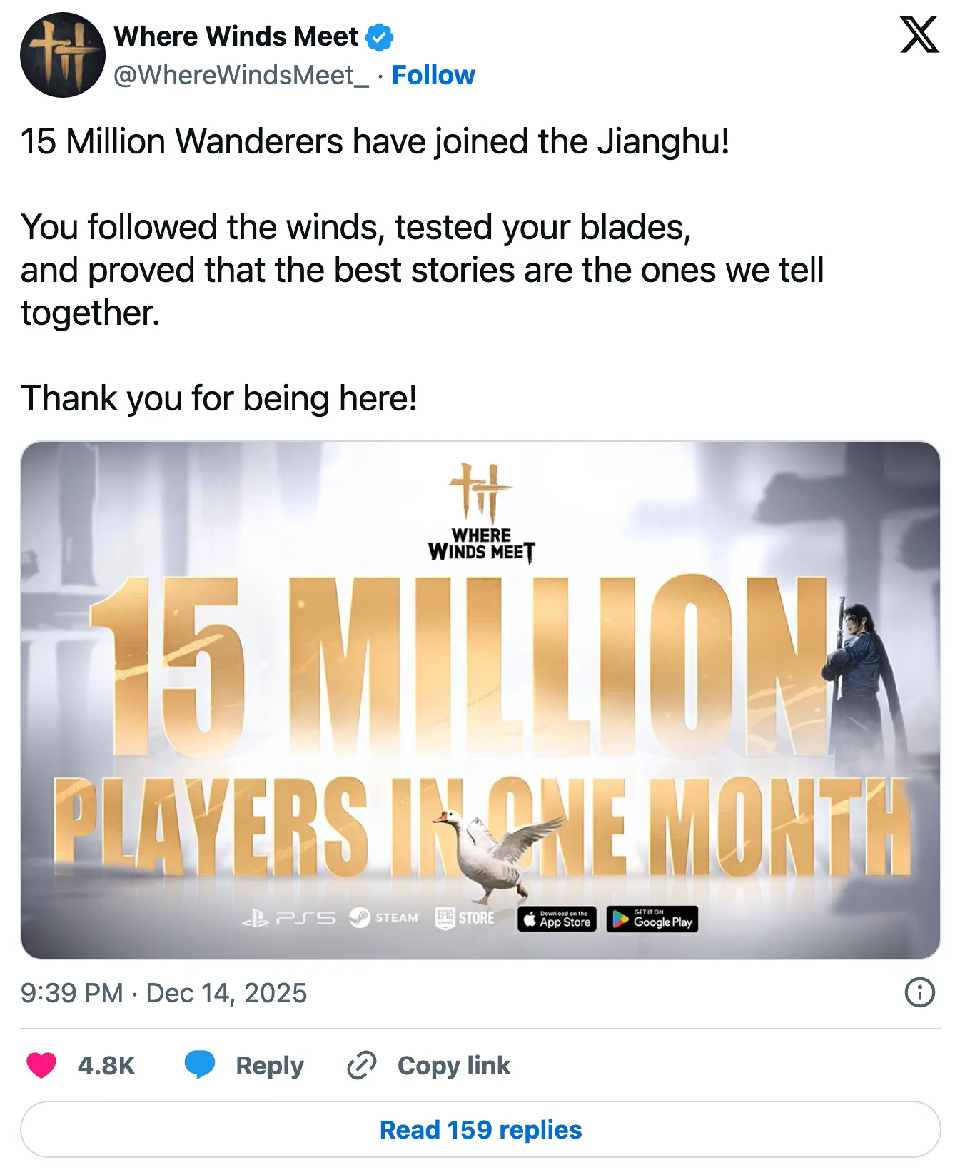 Where Winds Meet chia sẻ cột mốc mới nhất qua các kênh mạng xã hội chính thức của game. Everstone Studio xác nhận phiên bản toàn cầu của Where Winds Meet đã có 15 triệu người chơi trải nghiệm trên console tại gia, PC và bản di động. Trong khi trước đó Where Winds Meet chỉ phát hành độc quyền tại Trung Quốc cho giai đoạn early access, trò chơi cần hai tháng ở thị trường Trung Quốc để đạt cùng mức độ thành công. Where Winds Meet cũng ra mắt môn phái mới Velvet Shade để kỷ niệm một tháng, mang đến các kỹ năng mới cho người chơi sử dụng cùng vũ khí Vernal Umbrella.