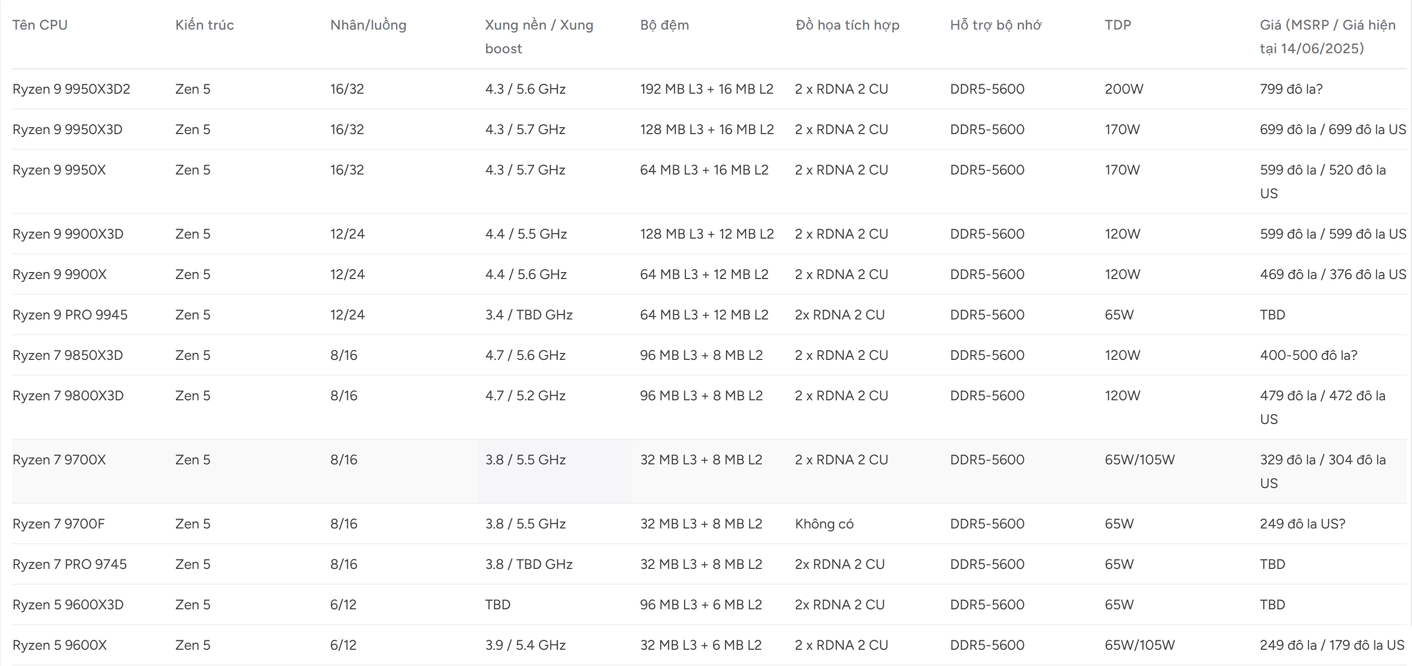 Bảng thông số các CPU AMD Ryzen 9000 "Granite Ridge" Desktop: