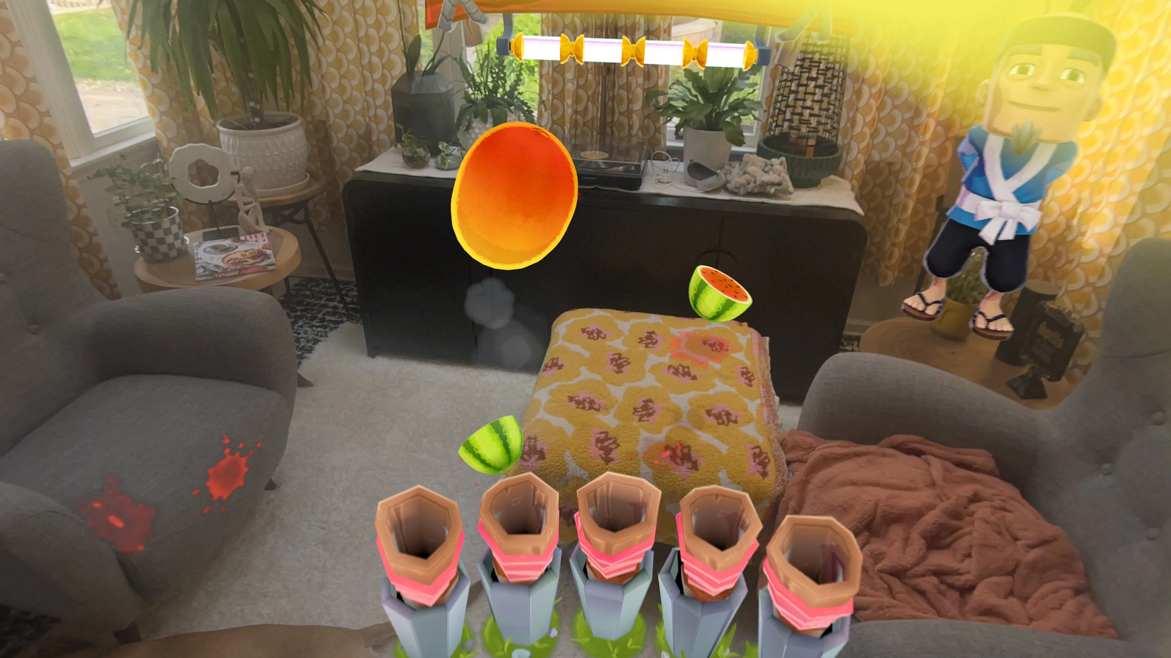 Tôi so sánh Vision Pro M5 với Vision Pro M2 gốc cạnh nhau, và model mới tải Fruit Ninja nhanh hơn vài giây. Đồ họa trông sắc nét hơn trong phòng ánh nắng của tôi, nhưng không phải là sự khác biệt lớn. Chế độ xem pass-through trực tiếp qua Vision Pro M5 cũng ít bị mờ chuyển động hơn. Vì vậy khi bạn nhìn xung quanh, nó cảm giác giống thực tế hơn là một chương trình phát sóng về môi trường xung quanh.