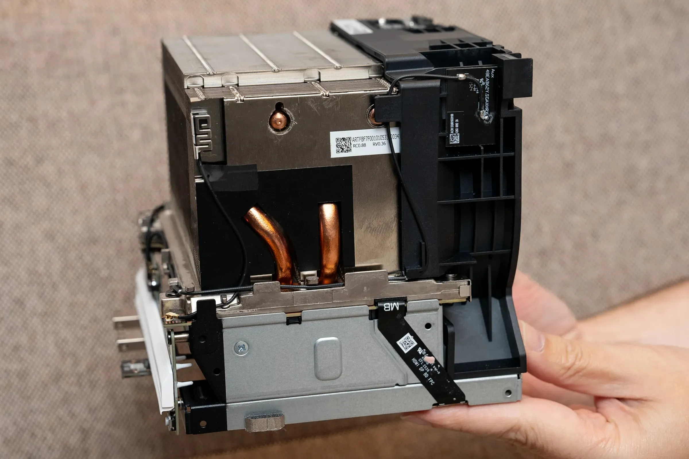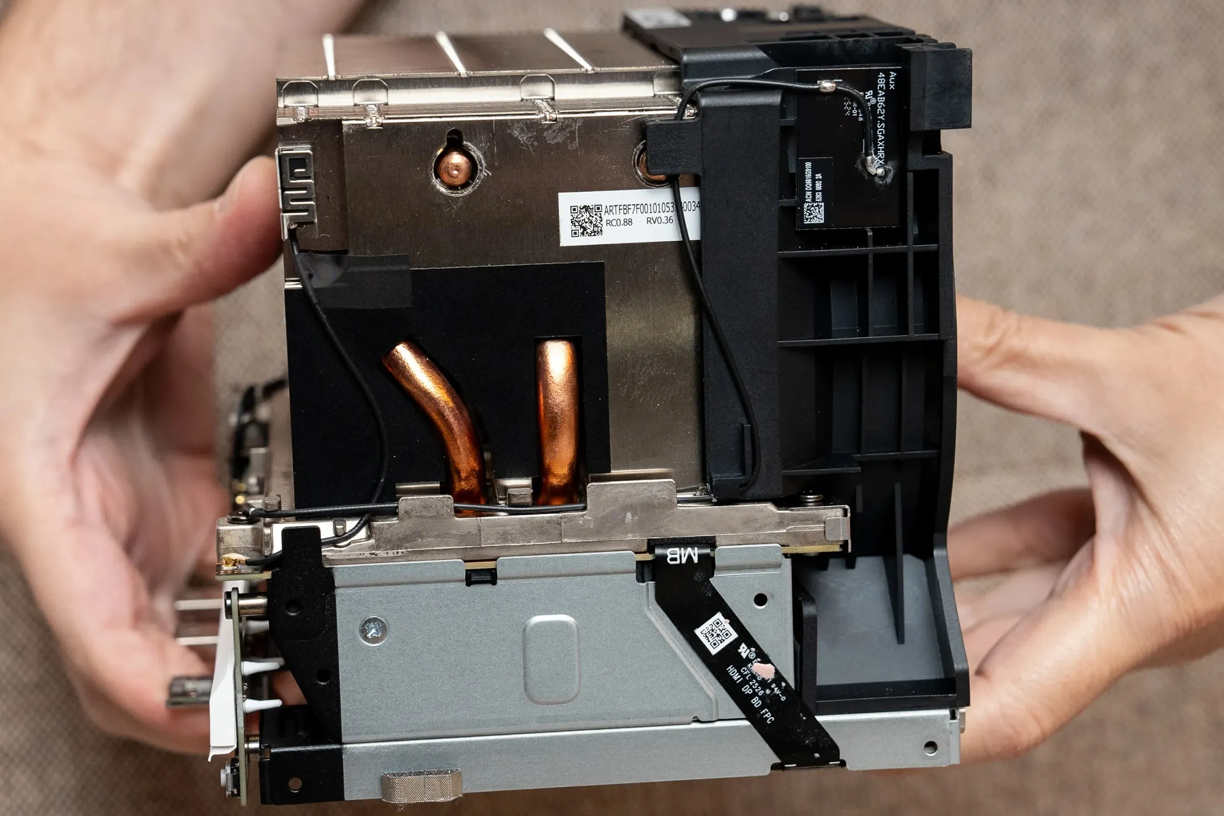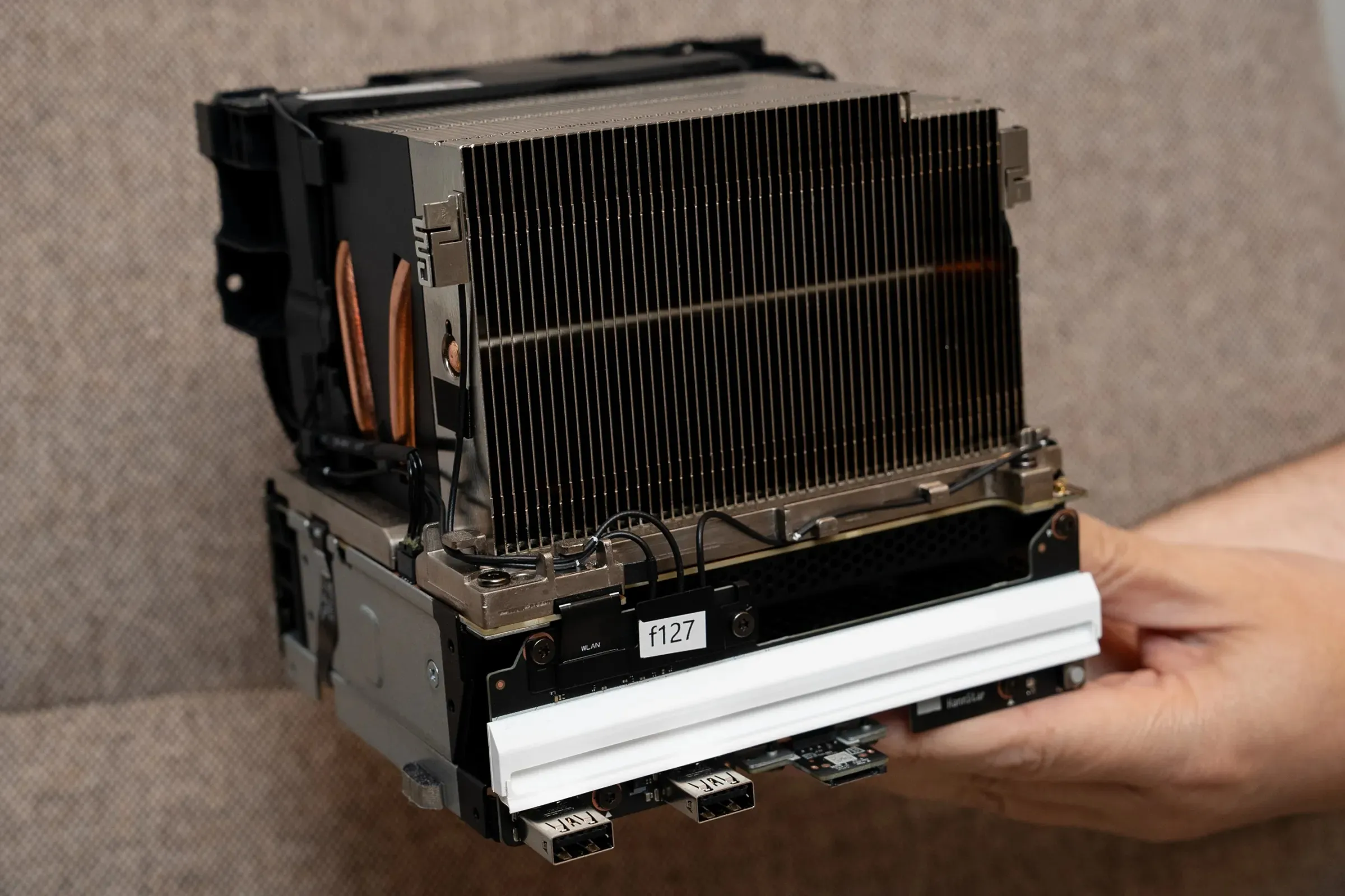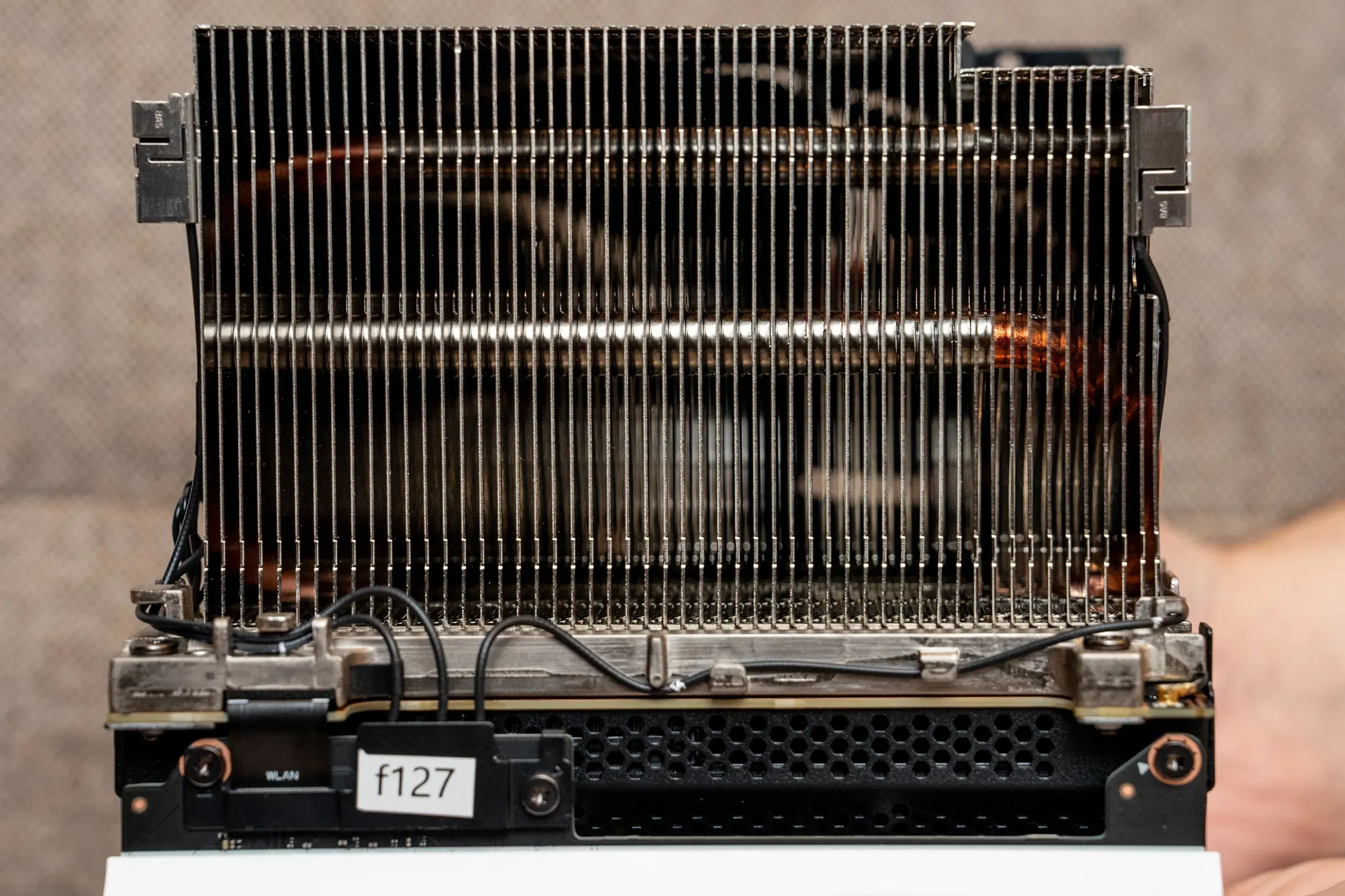 Aldehayyat nói rằng nhóm đã thiết kế toàn bộ Steam Machine xung quanh hệ thống làm mát của nó — bắt đầu với quạt PC 120mm siêu yên lặng với hình học cánh tùy chỉnh. "Chúng tôi có lẽ có nhiều thời gian động lực học chất lỏng tính toán hơn một đội F1 trong một năm lịch," anh ấy đùa. "Chúng tôi cũng có rất nhiều thời gian đường hầm gió trên nó." Sau đó, Valve và các đối tác thành phần đã xây dựng một tản nhiệt có vây lớn cao bằng quạt đó, với ống nhiệt nhúng — và làm cho nó có chức năng kép là che chắn RF giữa bo mạch chủ và bốn anten chuyên dụng của nó, bao gồm hai cho Wi-Fi 6E, một cho Bluetooth, và một chỉ để kết nối với Steam Controller mới của nó.