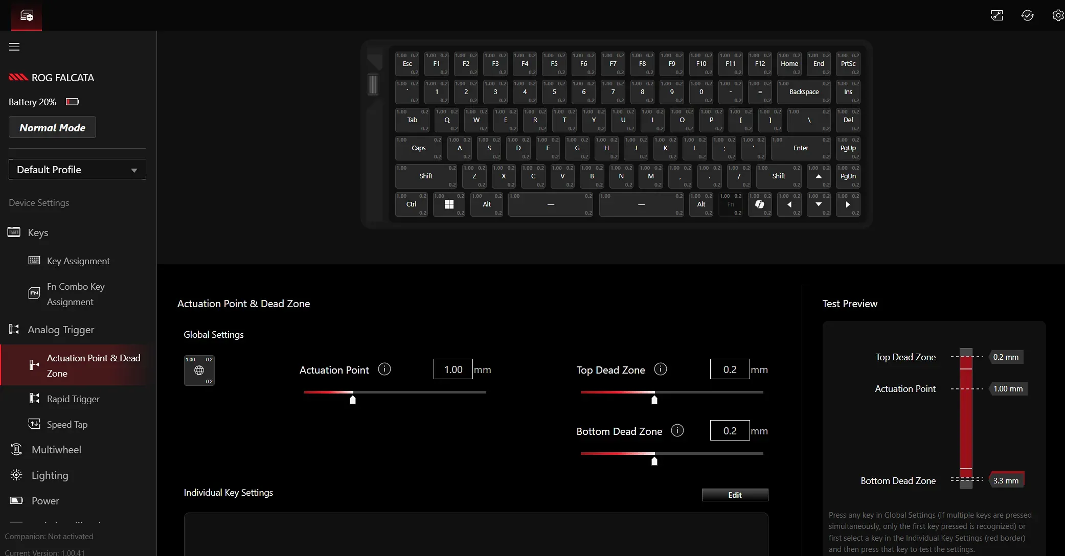 Một cách là sử dụng Gear Link, ứng dụng dựa trên trình duyệt của Asus. Trong trường hợp của tôi, việc điều chỉnh vùng chết cho mỗi phím đã giúp loại bỏ các lần nhầm lẫn. Bạn thậm chí có thể điều chỉnh các cài đặt này qua bánh xe cuộn đa năng của bàn phím. Nó được thiết kế để nhanh hơn, và với một số người có thể như vậy, nhưng tôi cảm thấy nó cồng kềnh hơn so với chỉ sử dụng ứng dụng web.
