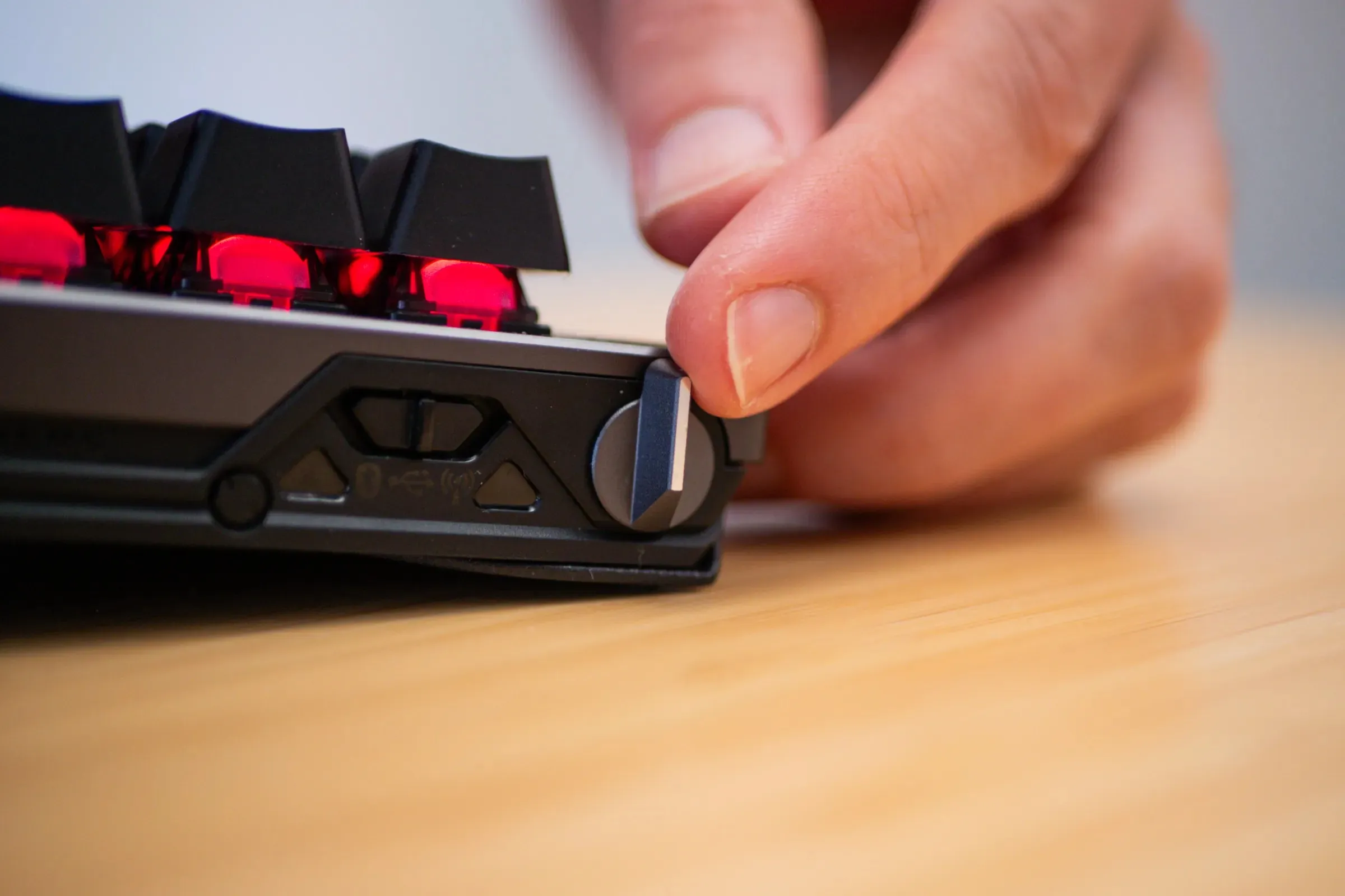 Quay lại rapid trigger (kích hoạt nhanh) và Speed Tap (nhấn tốc độ): Chúng được xây dựng để giúp bạn làm những việc trong game mà nếu không sẽ không thể, do giới hạn của tốc độ phản xạ hoặc phần cứng bàn phím. Rapid trigger (kích hoạt nhanh), mặc định tắt và được kích hoạt bằng cách lật một công tắc gần núm xoay đa năng, cho phép kích hoạt phím reset ngay lập tức khi thả ra, ngay cả khi bạn chưa hoàn thành chuyển động nhấn phím đầy đủ, chuẩn bị cảm biến để nhận đầu vào khác nhanh hơn so với các switch vật lý trên bàn phím đối thủ có thể.