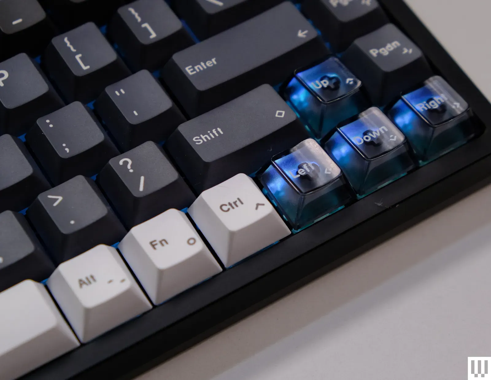 Ở góc trên bên trái và góc dưới bên phải, bàn phím sử dụng keycap ABS bóng với in UV trên đỉnh. Trong khi những cái này có thể trông thuần túy thẩm mỹ, tôi thấy chúng cũng thực tế: Kết cấu mượt mà giúp dễ dàng tìm thấy phím Escape hoặc phím mũi tên mà không cần nhìn xuống.
