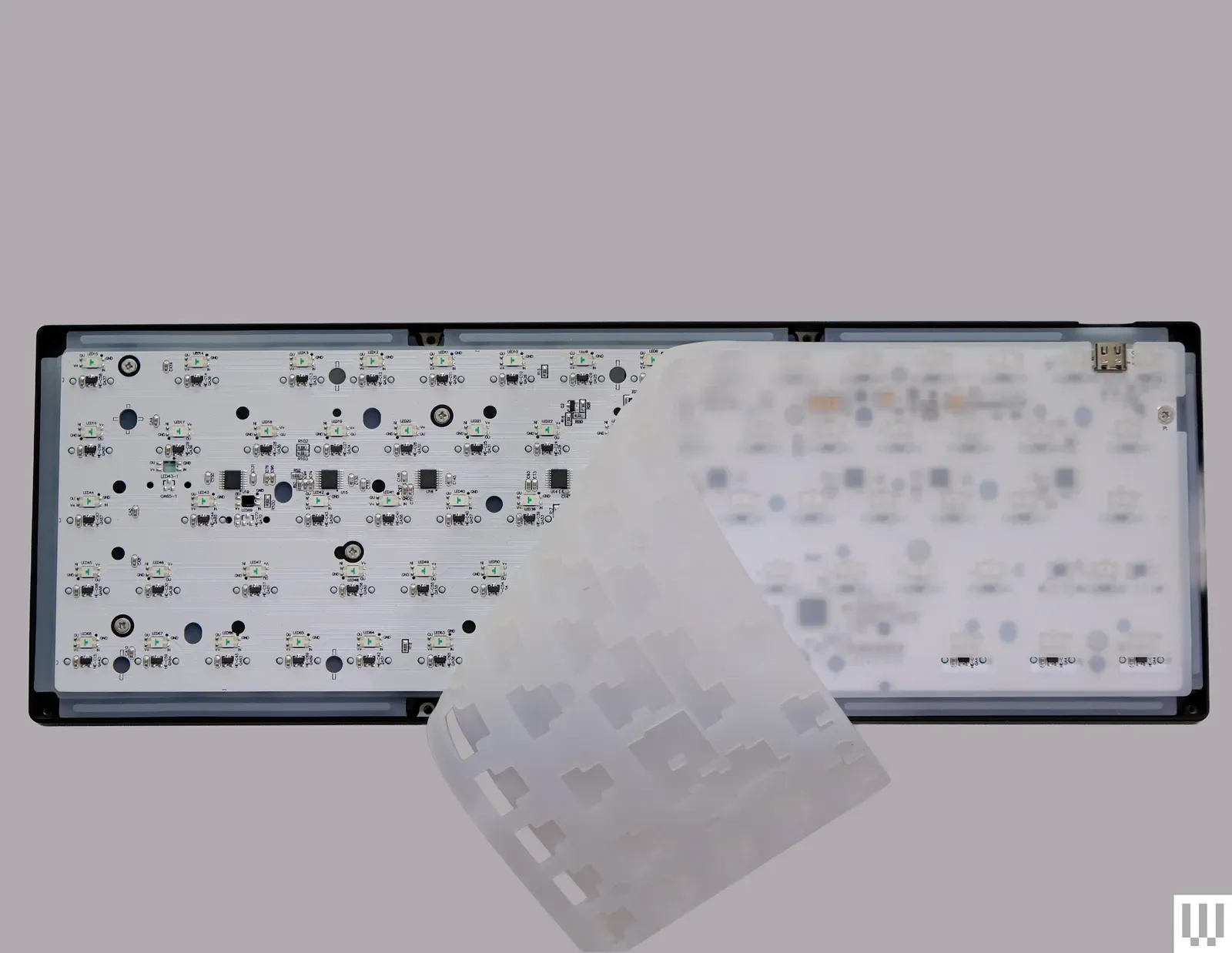 Lắp ráp bên trong khá đơn giản: Bo mạch in (PCB) và plate switch được vặn lại với nhau, kẹp một tấm silicone giữa chúng. Silicone này lấp đầy không gian trống giữa plate và PCB, và mở rộng ra ngoài ở mép ngoài để tạo gasket mà hai nửa của vỏ giữ tại chỗ. Với điều này, lắp ráp bên trong được giữ tại chỗ mà không tiếp xúc trực tiếp với vỏ ngoài, giảm rung và tiếng ồn thừa.