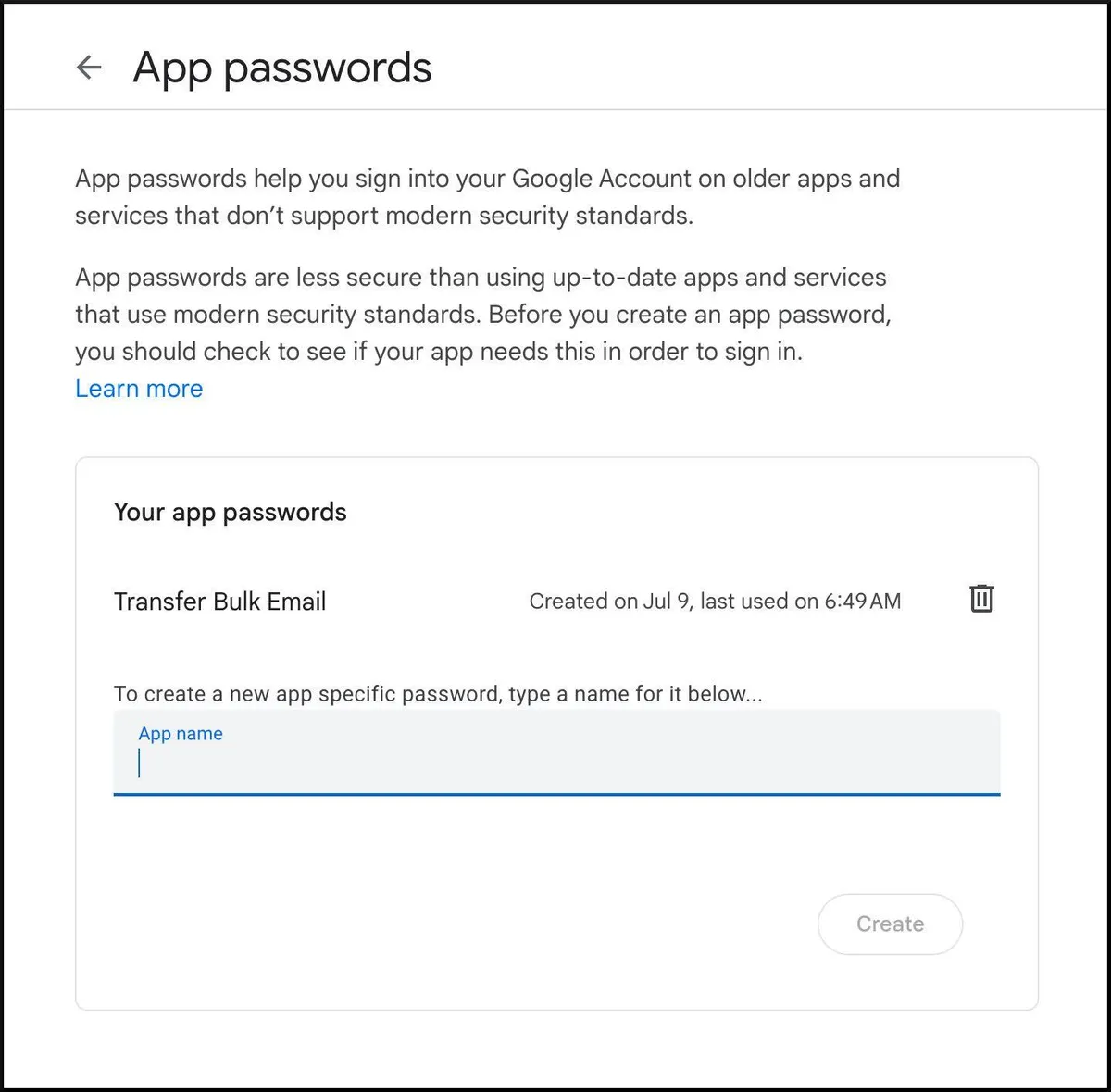 Nếu mật khẩu Google thông thường của bạn không hoạt động để đồng bộ tài khoản Gmail, hãy truy cập https://myaccount.google.com/apppasswords để tạo mật khẩu ứng dụng. Chỉ cần tạo tên cho mật khẩu -- tôi đã sử dụng "Transfer Bulk Email" -- và sau đó nhấn nút Create. Bạn sẽ nhận được cửa sổ bật lên với mã 16 kí tự mới của mình.