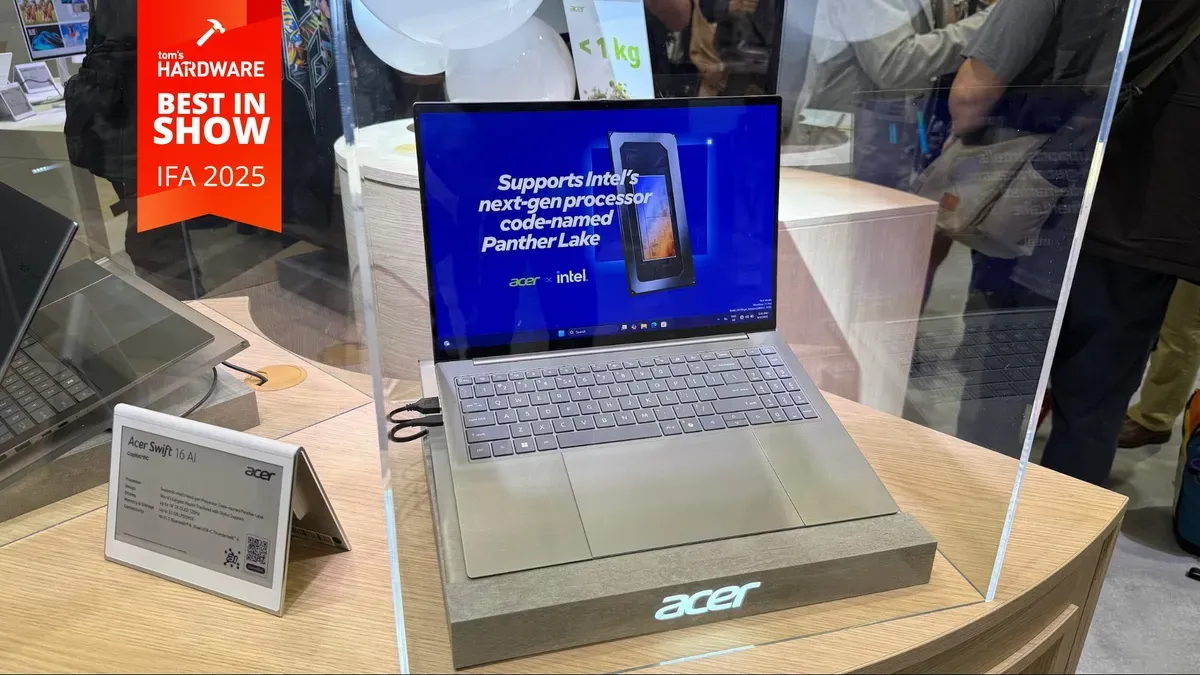 Acer gây bất ngờ khi trưng bày laptop hỗ trợ bộ xử lý Panther Lake của Intel tại họp báo IFA. Swift 16 AI là laptop 16 inch (≈ 40,64 cm) với màn hình 3K, 120 Hz và theo Acer, bàn di (touchpad) xúc giác lớn nhất hiện có, còn hỗ trợ bút.