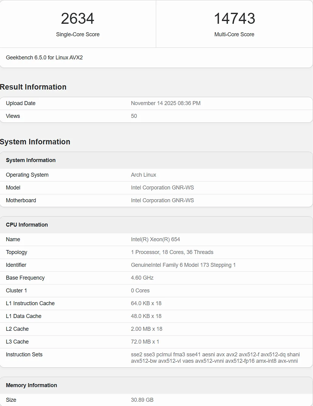 Chip mới được gọi là Intel Xeon 654 và đã được thử nghiệm trên nền tảng tham chiếu GNR-WS với 32 GB bộ nhớ DDR5. CPU có 18 nhân, 36 luồng, 72 MB bộ nhớ đệm L3 và 36 MB bộ nhớ đệm L2. Xung nhịp được đánh giá ở mức 4.60 GHz theo cơ sở dữ liệu Geekbench, nhưng tốc độ thực tế dao động quanh 4.80 GHz.
