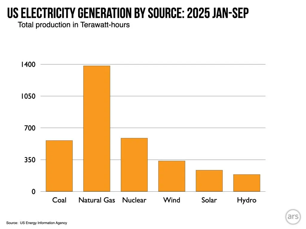 Nhưng kể từ khi dữ liệu quý I được công bố, nhu cầu đã đều đặn suy giảm. Theo dữ liệu phát hành ngày hôm qua của Cơ Quan Thông Tin Năng Lượng (EIA), bao phủ chín tháng đầu năm 2025, tổng nhu cầu điện đã tăng 2,3%. Sự chậm lại này có nghĩa là phần lớn nhu cầu tăng thêm có thể đã được đáp ứng bởi tăng trưởng đáng kinh ngạc của điện mặt trời.
