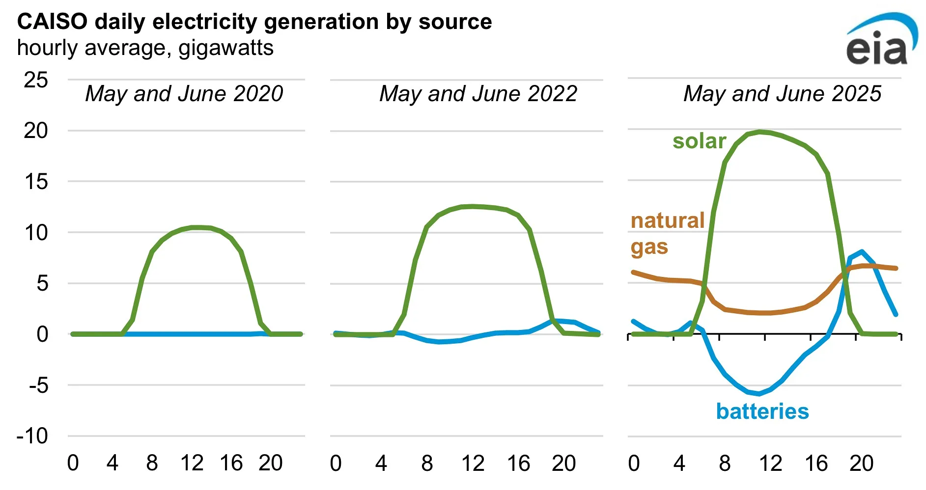 Sự tăng trưởng bùng nổ của điện mặt trời cũng dẫn tới thừa điện vào mùa xuân và mùa thu, khi nhu cầu sưởi/làm mát ở mức thấp nhất. Điều đó kéo theo làn sóng xây dựng hệ pin lưu trữ để hấp thụ điện rẻ và bán lại sau khi Mặt Trời lặn. Tác động của pin gần như không thể nhận thấy vào năm 2023, nhưng dữ liệu tháng 5 và 6/2025 cho thấy pin hút nhiều điện vào giữa ngày, và dùng nó đầu buổi tối để hoàn toàn bù đắp cú tăng vọt vốn dĩ sẽ rất lớn trong sử dụng khí tự nhiên.