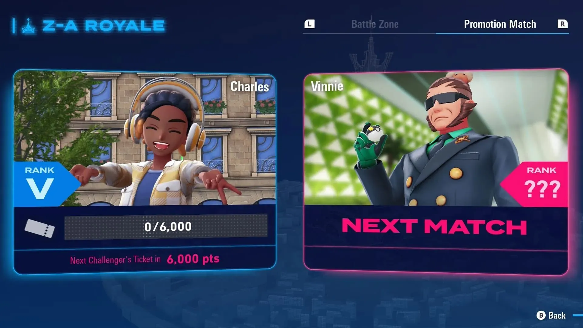 Vào đầu mỗi chu kỳ đêm, một Battle Zone sáng lên màu đỏ và trở nên đầy ắp các huấn luyện viên thuộc nhiều cấp bậc khác nhau mà bạn phải đánh bại để thu thập một số điểm được chỉ định. Và khi bạn có đủ điểm, bạn sẽ mở khóa một trận chiến đặc biệt, khó khăn hơn một chút để xác định liệu bạn có thăng hạng hay không. Trong các trò chơi Pokémon trước đây, có thể dễ dàng vượt qua các trận gym vì cách các leader và các huấn luyện viên liên quan đều sử dụng cùng loại quái vật. Nhưng nhiều người tham gia Z-A Royale sử dụng các đội pokémon đa dạng hơn, đòi hỏi nhiều suy nghĩ linh hoạt hơn. Z-A Royale cũng là một showcase tuyệt vời về những loại người sống ở Lumiose — có những người xã hội, bồi bàn và nhân viên giao hàng làm việc quá sức, tất cả đều muốn nếm trải vinh quang.