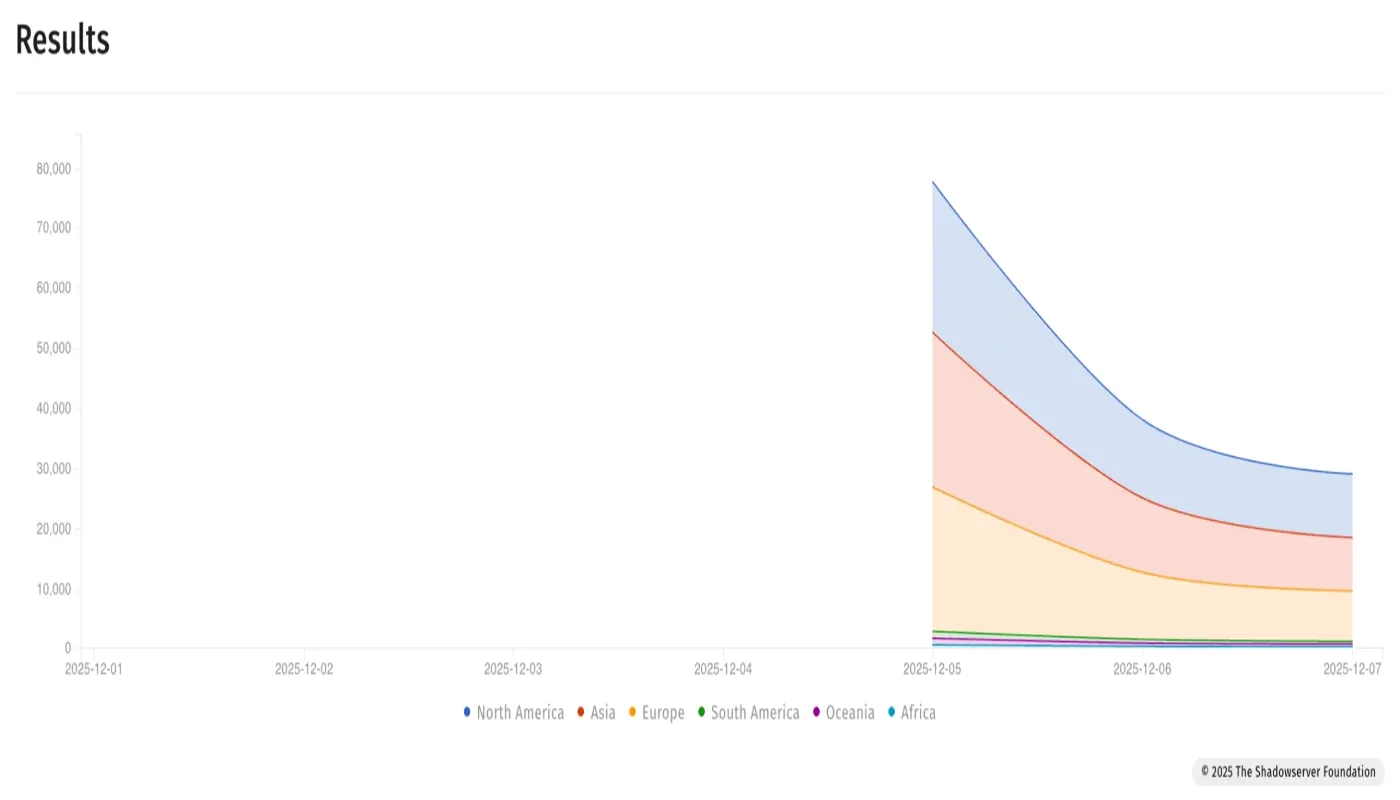 - Shadowserver ban đầu ghi nhận 77.664 IP dễ bị tấn công ngày 5/12, và vẫn còn 28.964 ngày 7/12, tập trung nhiều tại Mỹ, Đức, Trung Quốc.