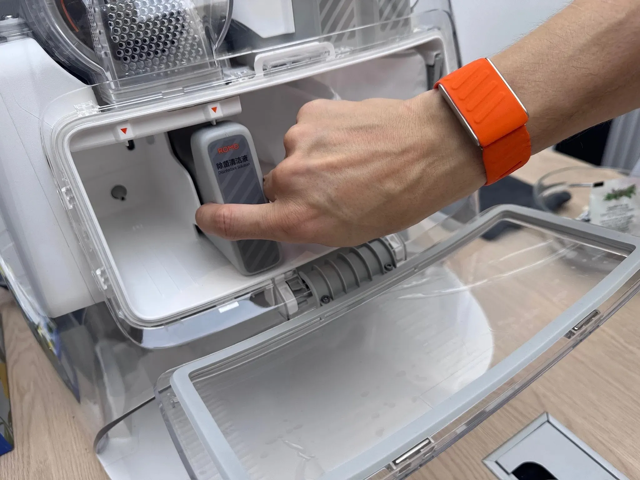 Trạm đế tự làm sạch của Romo cũng có một vài tính năng độc đáo, bao gồm một khe cho "dung dịch khử mùi sàn" bên cạnh dung dịch làm sạch tiêu chuẩn trong mẫu P. Điều này cho bạn tùy chọn làm cho sàn nhà có mùi thơm sau khi hút bụi thay vì lau hoàn toàn bằng dung dịch làm sạch, đây là một nâng cấp tốt. Nó cũng có hệ thống phun áp suất cao để làm sạch miếng lau, cùng với không khí nóng để sấy khô.