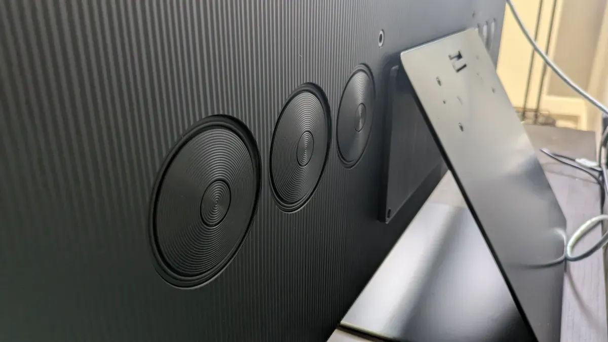Mặc dù có yếu tố hình thức siêu mỏng, S95F đóng gói một mảng loa 4.2.2 kênh, 70W cung cấp đối thoại rõ ràng và bass ấn tượng đáng ngạc nhiên. Dolby Atmos được hỗ trợ, và tính năng Object Tracking Sound+ của TV ánh xạ chính xác hiệu ứng âm thanh với hành động trên màn hình.