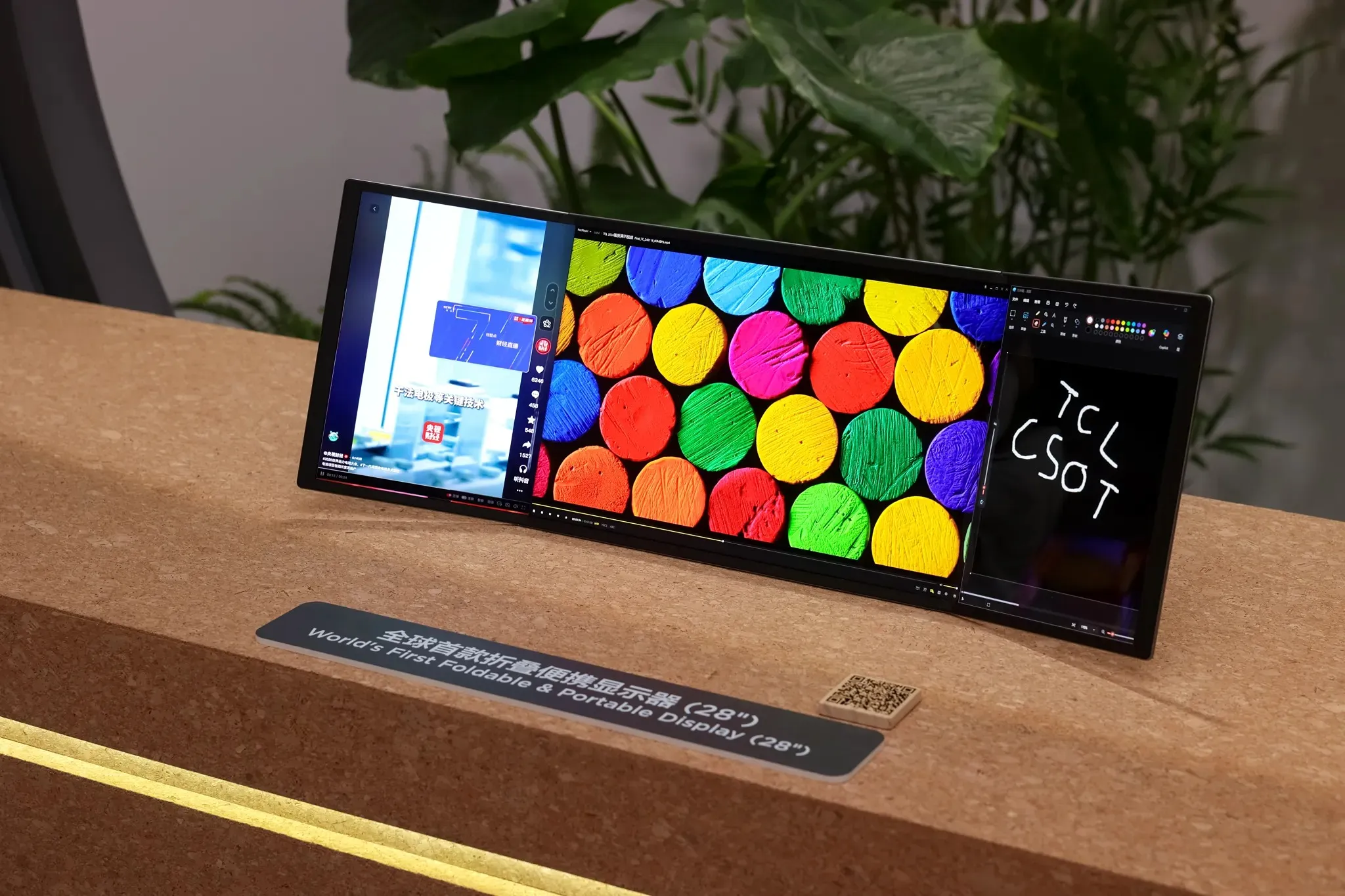 Giờ hãy xem vài sản phẩm IJP OLED nổi bật trưng bày tại DTC. Nổi bật có Màn Hình MB OLED RGB Stripe “Thực” đầu tiên thế giới (5,65 inch), đạt cấu trúc pixel 390 PPI ấn tượng cho màn di động. Gần đó là một Màn Hình Gập Và Di Động đầu tiên thế giới khác (28 inch), thiết kế gập ba cho kích thước laptop và mở ra thành không gian làm việc. Với game thủ, TCL CSOT trưng bày Màn Hình Gaming IJP OLED WQ 240 Hz (16 inch), lần đầu kết hợp OLED in phun mực với tần số làm tươi siêu mượt cho chơi game.