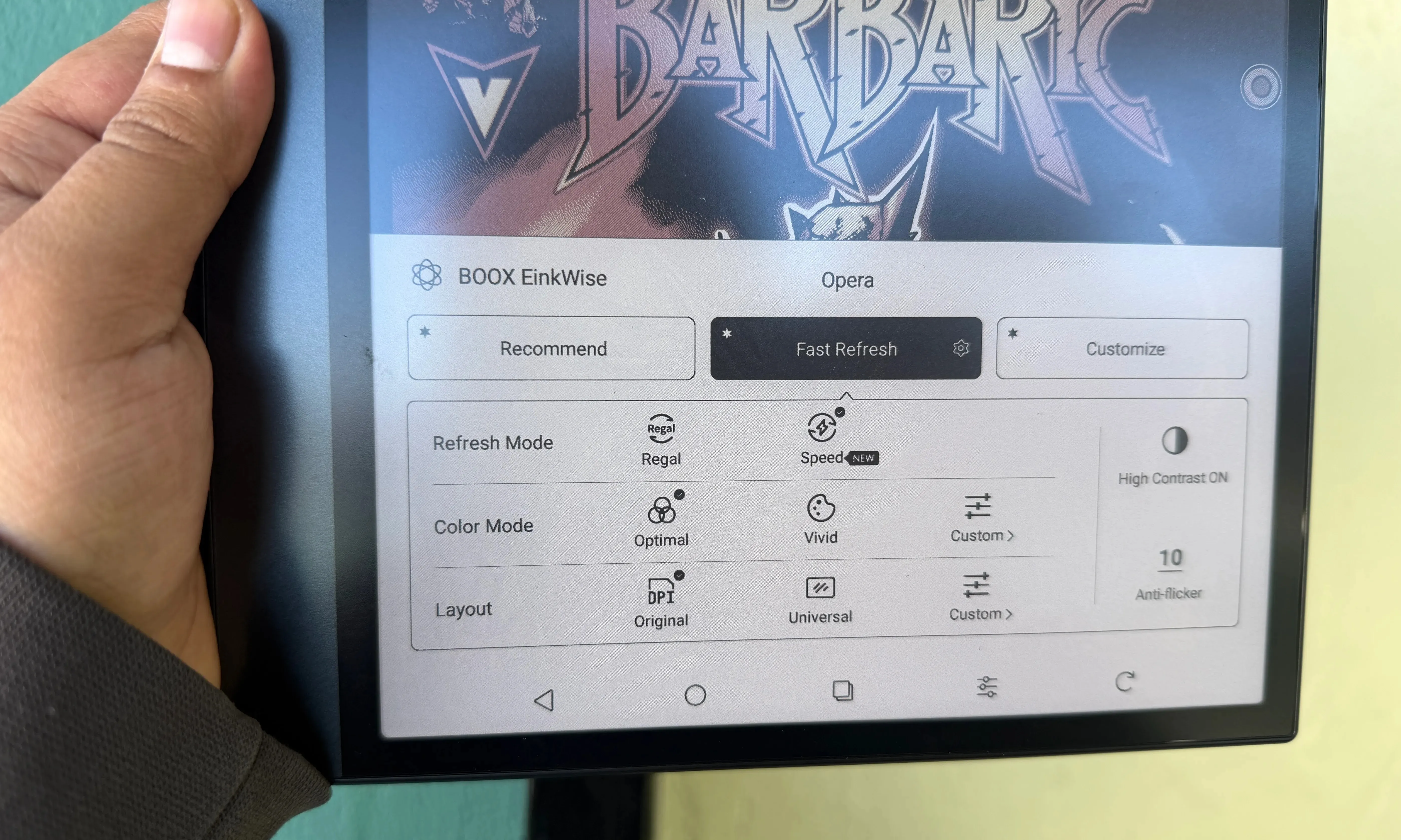 Tuy nhiên, tôi sẽ đề xuất chơi với các cài đặt tùy chỉnh, nơi bạn có thể chơi với các mức độ tương phản, sống động và độ sáng màu. Để đọc manga, sách hoặc bài báo, chế độ làm mới Speed hoạt động tốt nhất. Boox đã nâng cấp tốc độ làm mới và có rất ít giật lag khi bạn vuốt dọc hoặc chuyển trang.