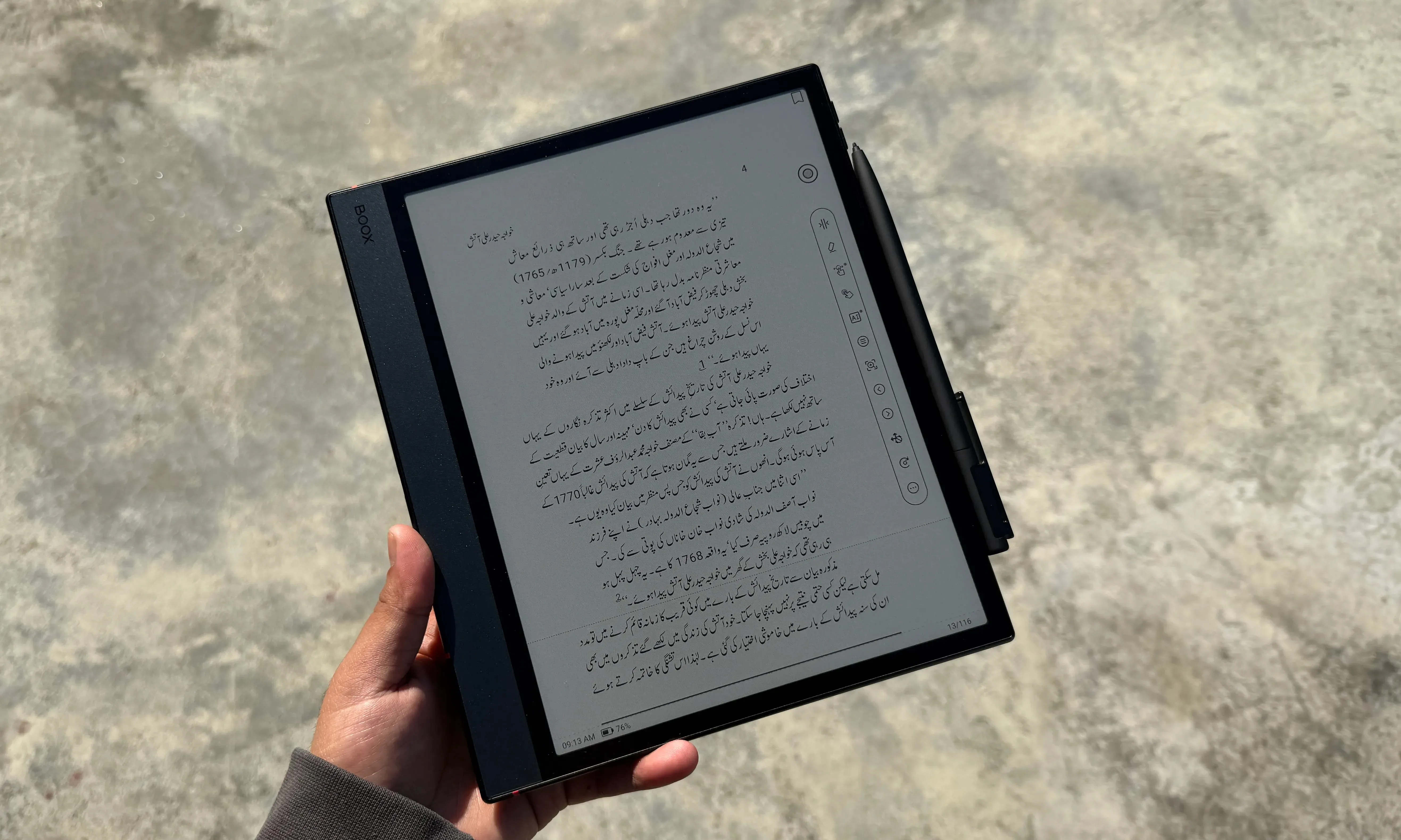 BOOX Pen3 Stylus, như thương hiệu gọi nó, có thể xử lý độ nhạy nghiêng và có thể xác định 4.096 mức độ áp lực. Kết hợp với lớp mờ trên màn hình cung cấp đúng lượng ma sát bề mặt cho chuyển động stylus được kiểm soát, bạn có được một trong những trải nghiệm ghi chép tinh tế nhất trên sổ tay kỹ thuật số.
