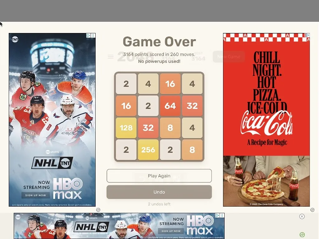 Thật bực bội, tác nhân đã ngừng chơi chỉ sau bốn phút, dừng lại ở điểm số 356 mặc dù bảng còn rất xa mới đầy. Tôi phải nhắc tác nhân thêm vài lần nữa để thuyết phục nó chơi trò chơi đến hoàn thành; cuối cùng nó đạt được tổng cộng 3164 điểm sau 260 nước đi. Điều đó khá tương tự với điểm số mà tôi có thể đạt được trong một trò chơi thử nghiệm với tư cách là một người mới chơi 2048, mặc dù các người chơi chuyên nghiệp được báo cáo đã ghi điểm cao hơn nhiều.