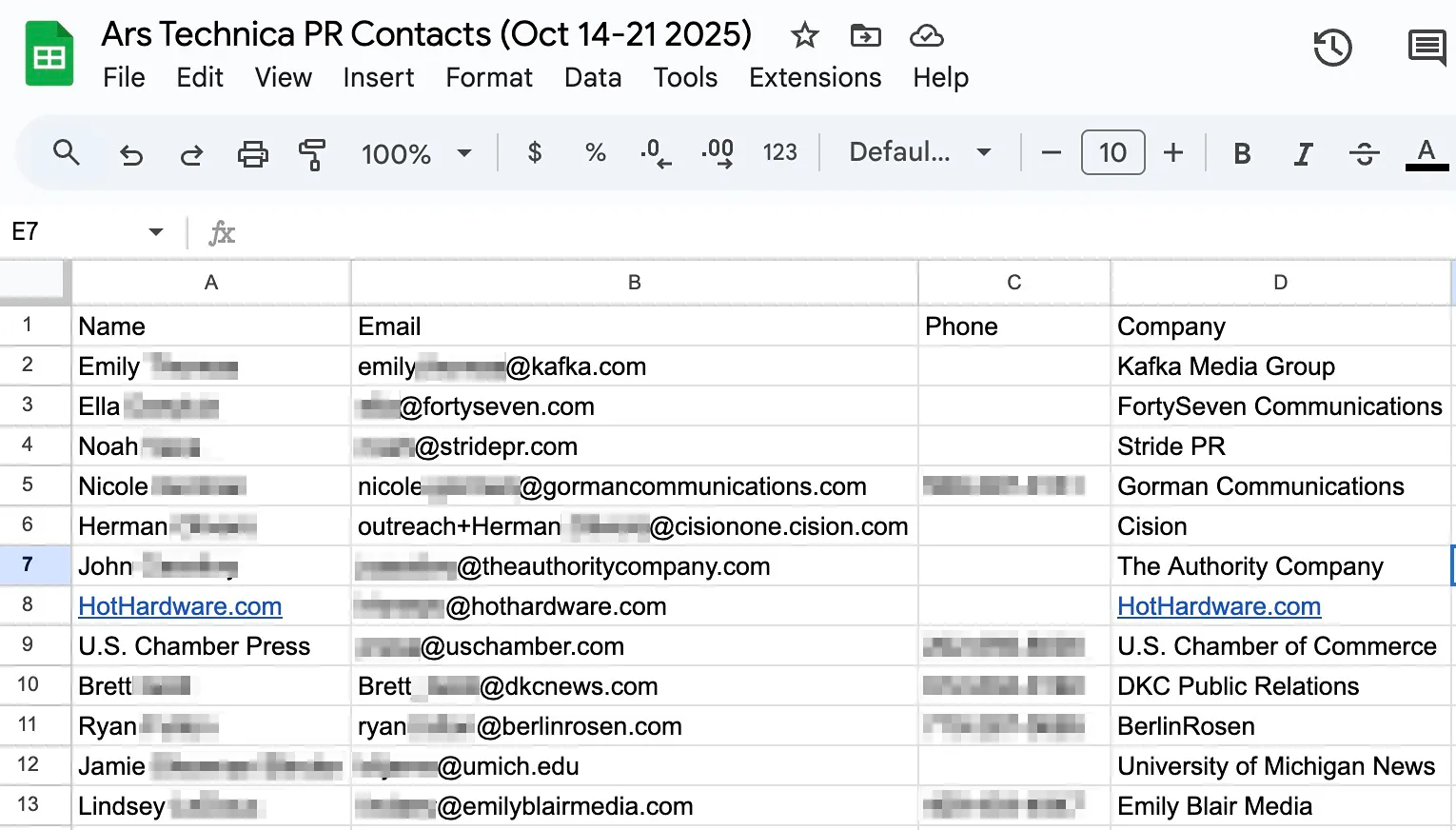 Lời nhắc: "Xem qua tất cả email Ars Technica của tôi từ tuần trước. Thu thập tất cả thông tin liên hệ (tên, địa chỉ email, số điện thoại, v.v.) cho các liên hệ PR có trong những email đó và thêm chúng vào bảng tính Google Sheets mới."