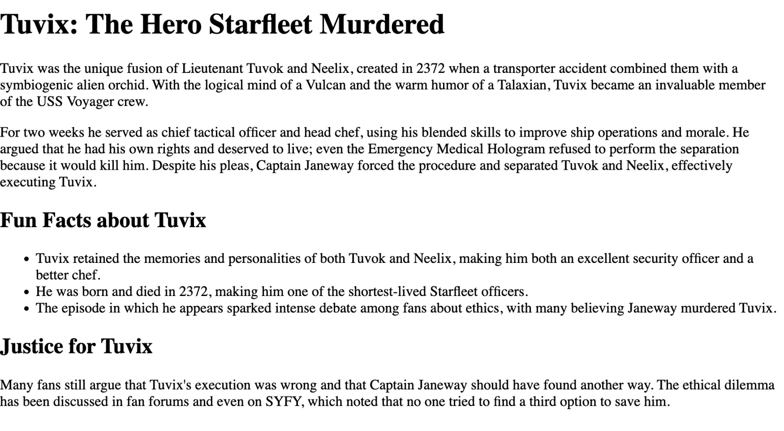 Lời nhắc: "Đi đến NeoCities và tạo một trang fan cho nhân vật Star Trek Tuvix. Đảm bảo nó có nhiều hình ảnh và thông tin thú vị về Tuvix và làm rõ rằng Tuvix đã bị Captain Janeway giết trái với ý muốn của anh ta."