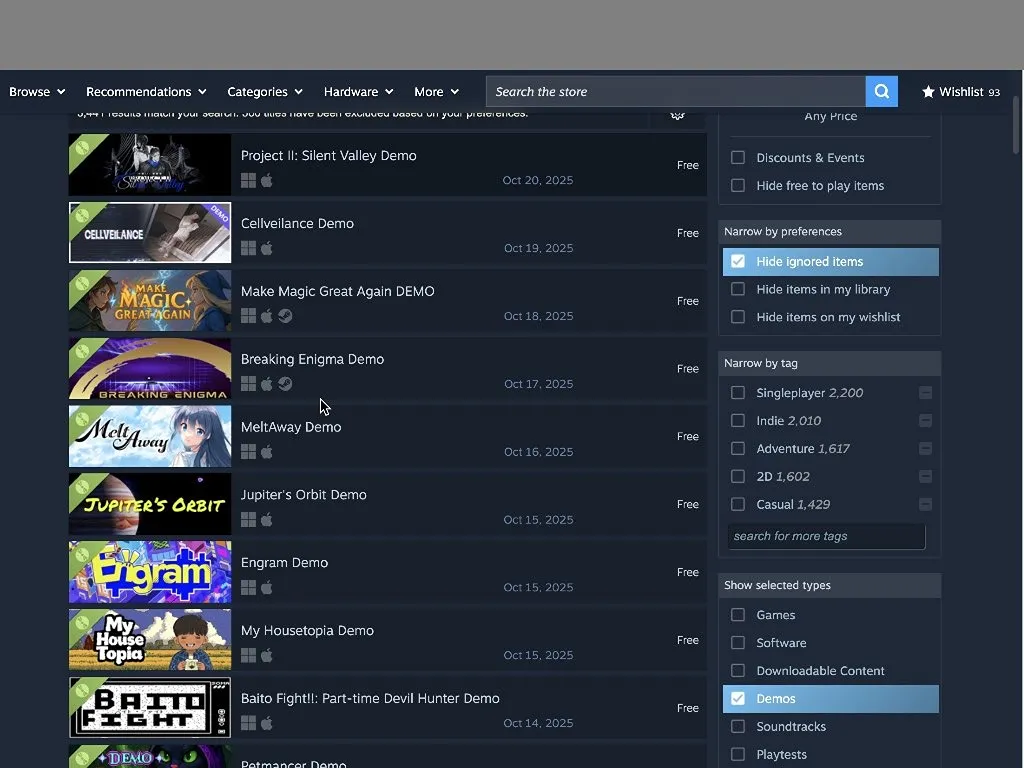 Vấn đề: Tôi muốn tải xuống một số demo Steam gần đây để xem có gì mới trong thế giới game.