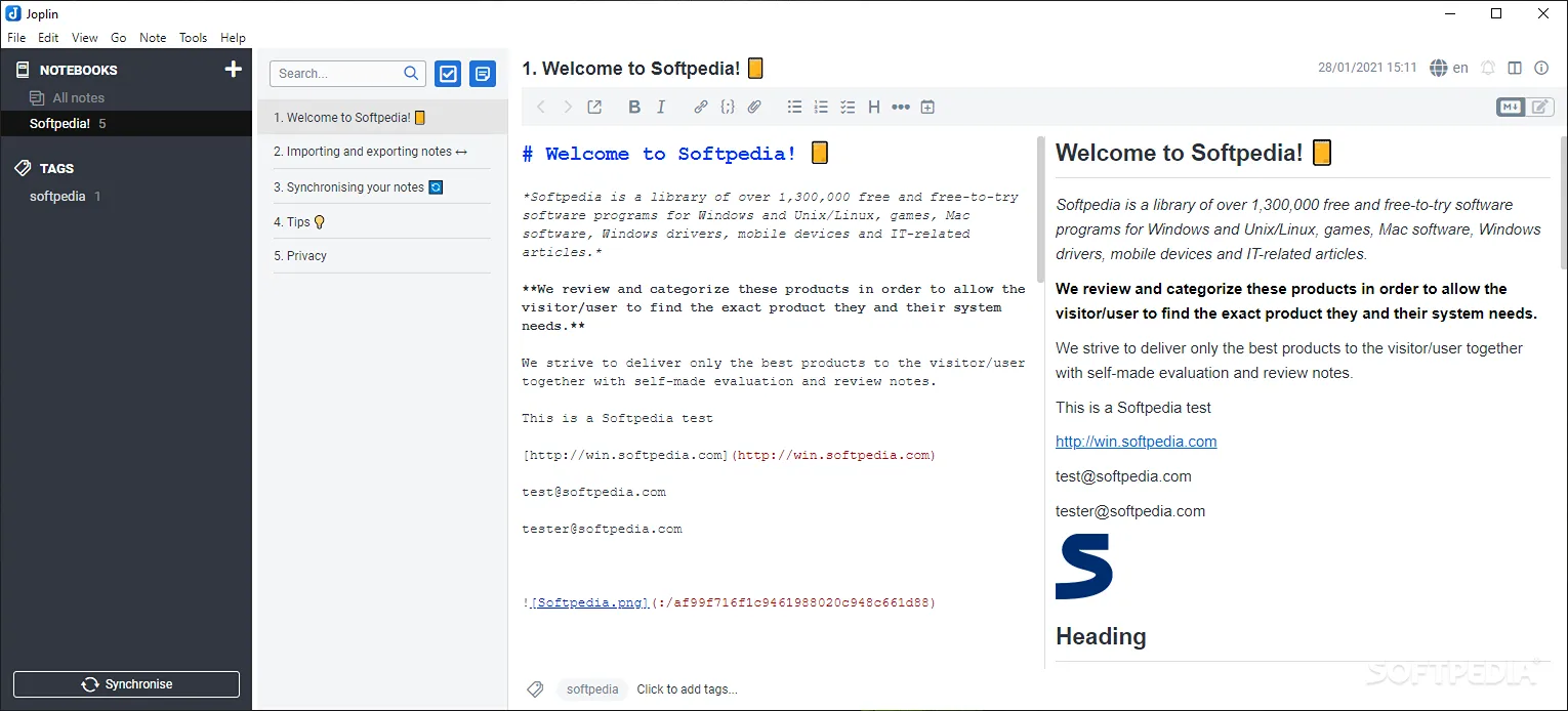 Giao diện Joplin được chia thành ba phần: thanh bên (danh sách ghi chú và thẻ), Danh sách Ghi chú (danh sách ghi chú hiện tại của bạn), và Trình chỉnh sửa Ghi chú (nơi bạn viết ghi chú của mình). Một điều hay về hệ thống Joplin Markdown là nó tạo ra các tệp Markdown tiêu chuẩn (không giống như Evernote, sử dụng hệ thống độc quyền), có nghĩa là bạn có thể mở những ghi chú đó trong bất kỳ ứng dụng nào hỗ trợ Markdown.
