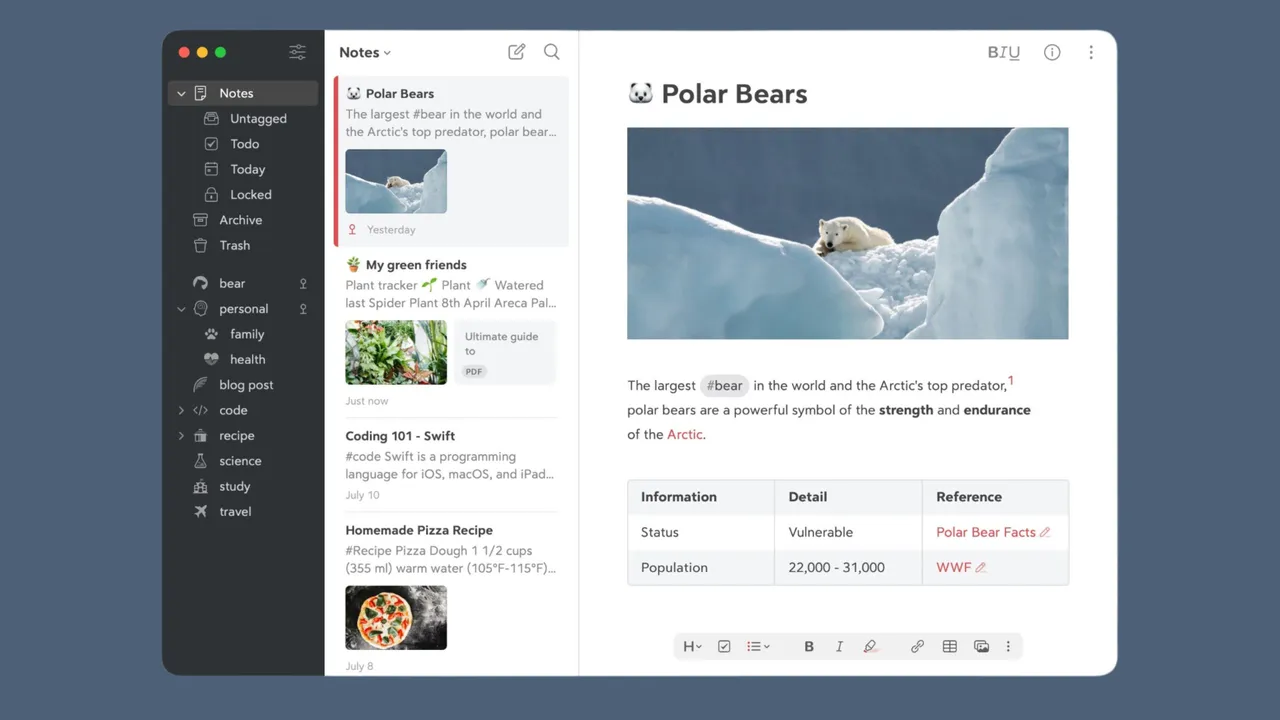Bear Markdown Notes chỉ có sẵn cho MacOS, iOS và iPadOS, điều này thật đáng tiếc vì đây là một ứng dụng tuyệt vời. Giao diện người dùng của Bear Markdown Notes là một trong những giao diện tốt nhất trong danh sách. Giao diện khá cơ bản, và nó bao gồm một ghi chú mặc định với tất cả sự trợ giúp bạn cần để bắt đầu.
