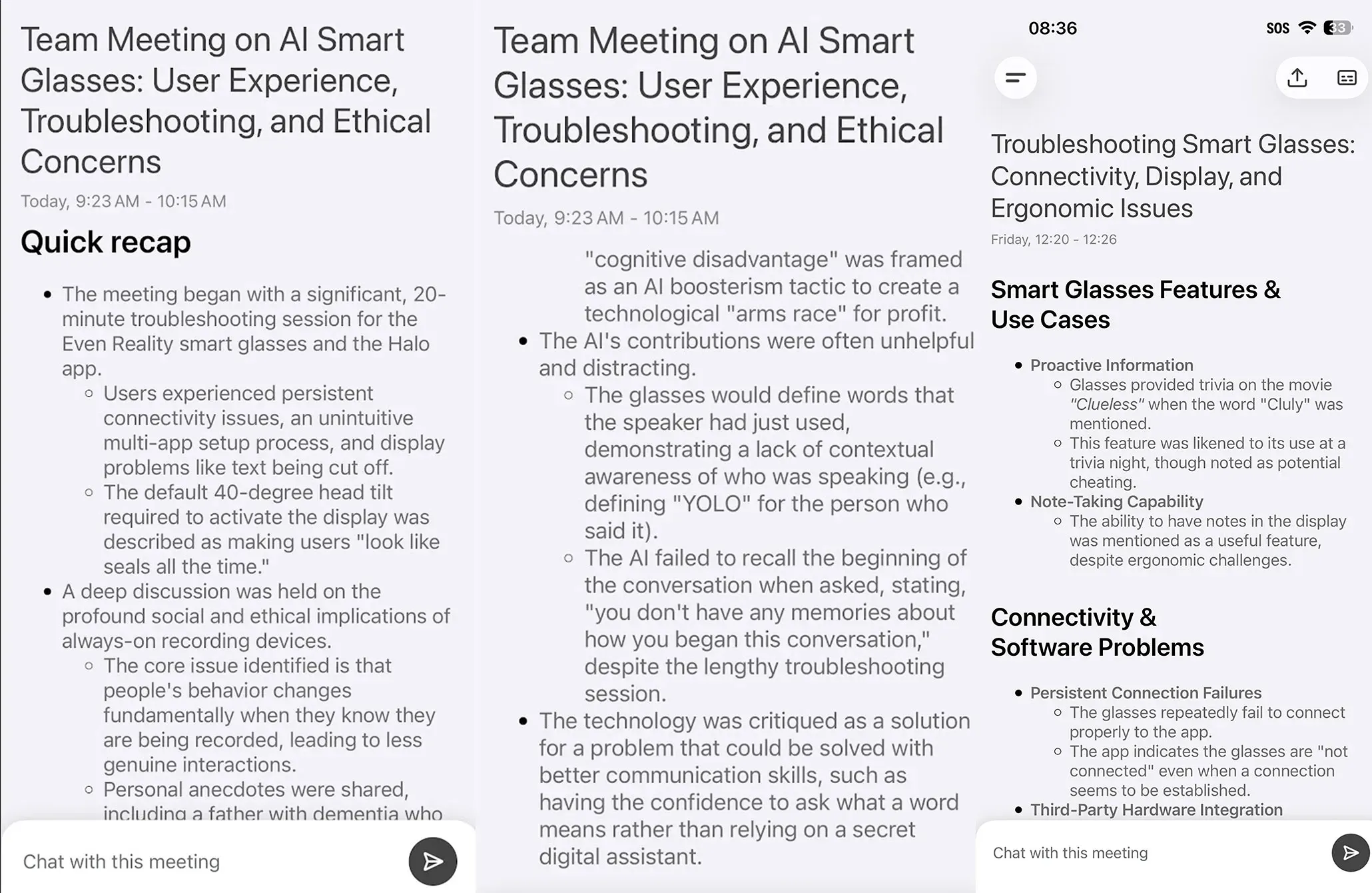 Nhưng cuối cùng, việc sử dụng Halo là một sự phân tâm hơn là một sự hỗ trợ. Suốt thời gian đó, khoảng 10% sức mạnh não bộ được dành để tự hỏi khi nào trợ lý sẽ xen vào hoặc ngắt kết nối. Đọc lại bản chuyển đổi cuộc trò chuyện của chúng tôi trong ứng dụng, có rất nhiều chủ đề bị bỏ lửng mà tôi ước chúng tôi đã đào sâu hơn, nếu không vì tất cả những sự phân tâm.