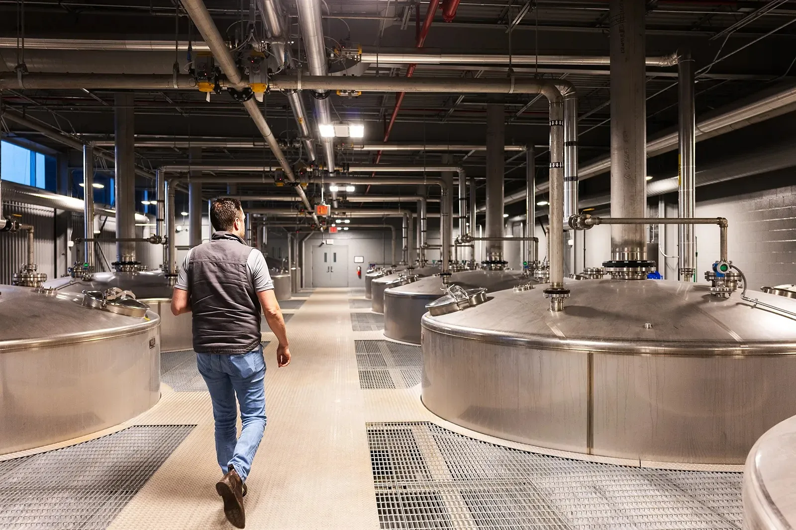 Whiskey House có bộ khung của một nhà máy chưng cất cổ điển, nhưng nó hoạt động giống như một nhà máy sản xuất thực phẩm hiện đại, dựa nhiều vào tự động hóa, kiểm soát dựa trên cảm biến và phân tích thời gian thực, tất cả đều hướng dẫn mọi khía cạnh của sản xuất. Mandell nói rằng quy mô mà công nghệ đang được sử dụng ở đây chưa từng được thực hiện trước đây trong ngành rượu mạnh.