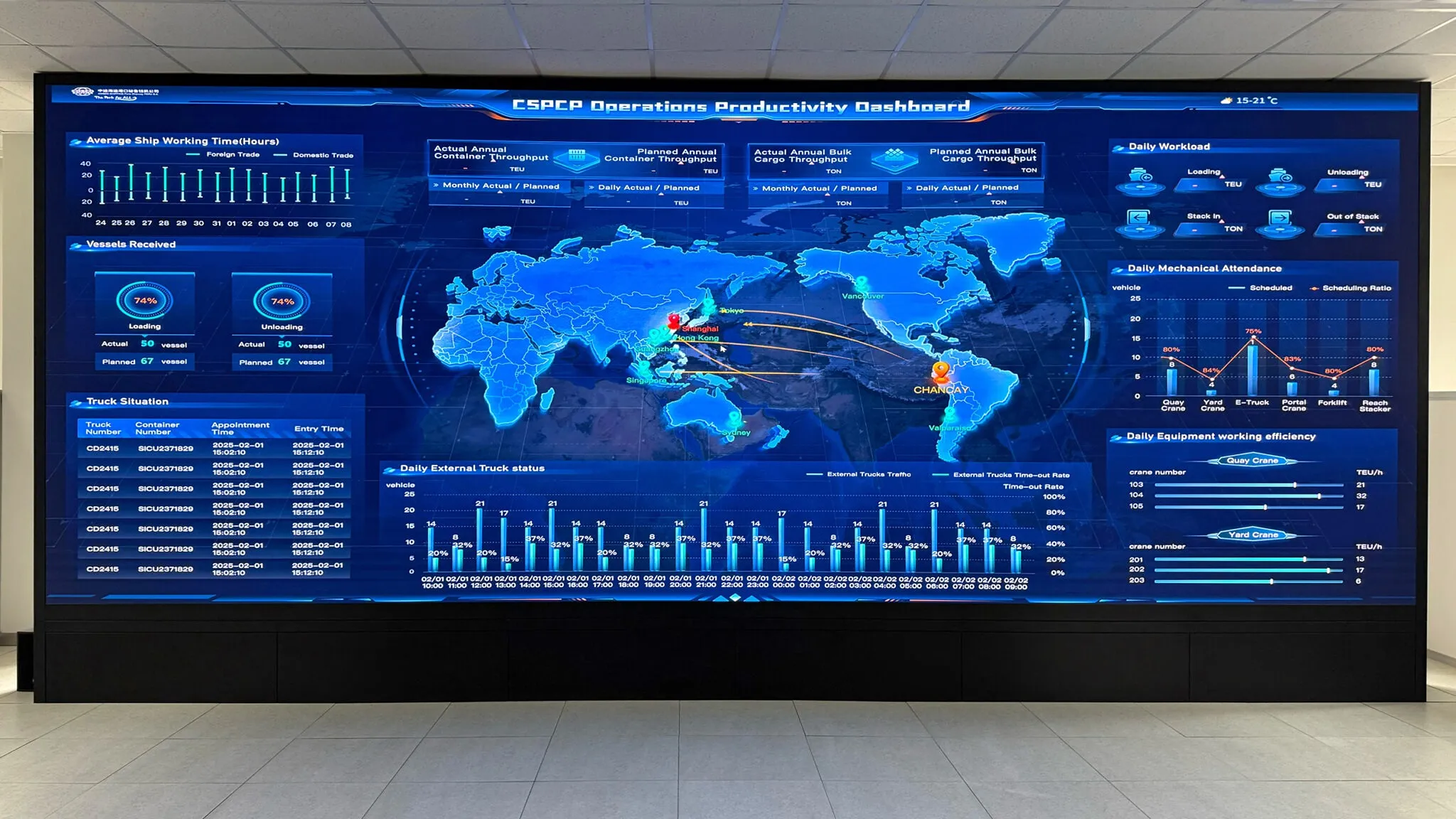 Khi cửa thang máy mở ra khu trung tâm điều hành tầng năm, một màn hình cỡ nhà hát hiện lên: các vị trí phương tiện, thời gian tàu nhập cảng, dữ liệu dỡ, các thống kê hiệu suất. Nổi bật nhất là những đường cung đậm màu vắt qua Thái Bình Dương xanh thẳm—những vệt số hóa minh họa lộ trình kéo dài hàng nghìn km, từ thành phố nhỏ bé này tới những cảng lớn nhất châu Á.