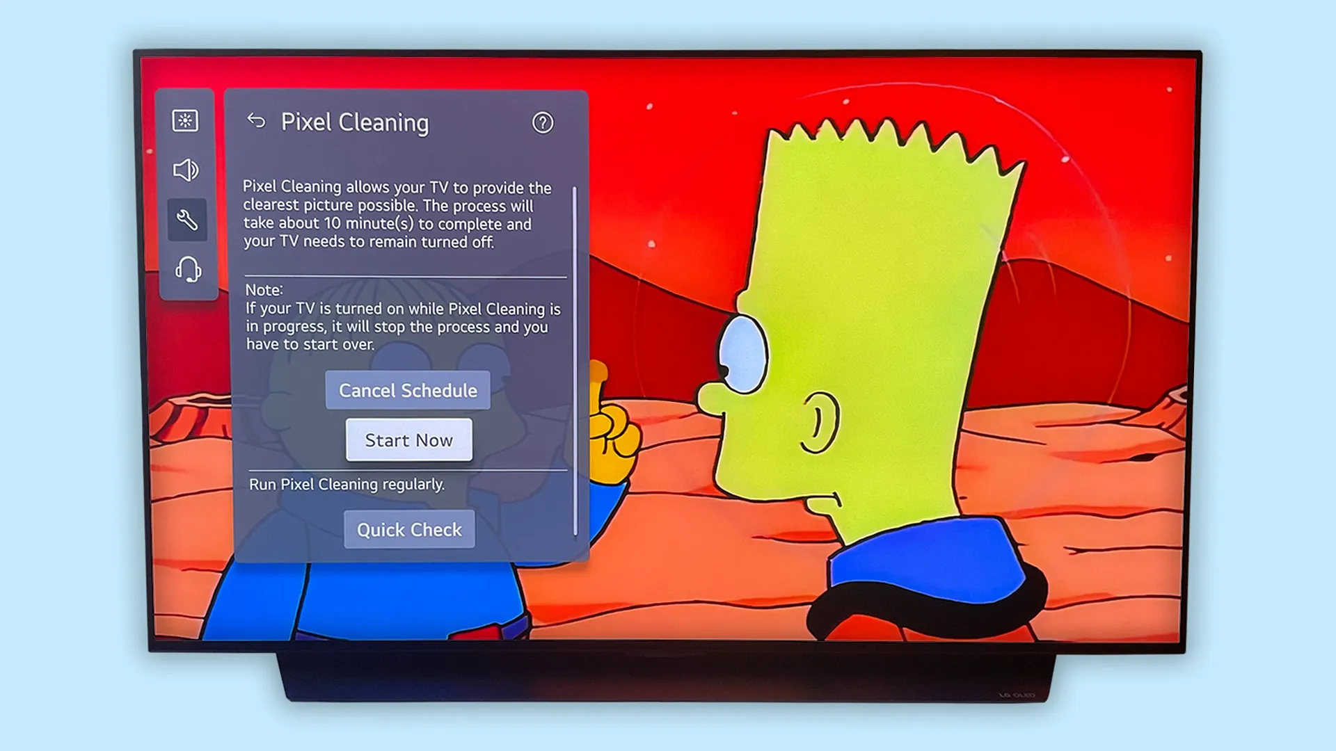 LG OLED cũng đi kèm với tiện ích gọi là Pixel Cleaning, còn được gọi là Pixel Refresh trên Samsung OLED và Panel Refresh trên Sony OLED. Quá trình này mất vài phút để chạy và tự động điều chỉnh độ sáng của pixel tùy thuộc vào việc có phát hiện sự không đồng đều hay không.