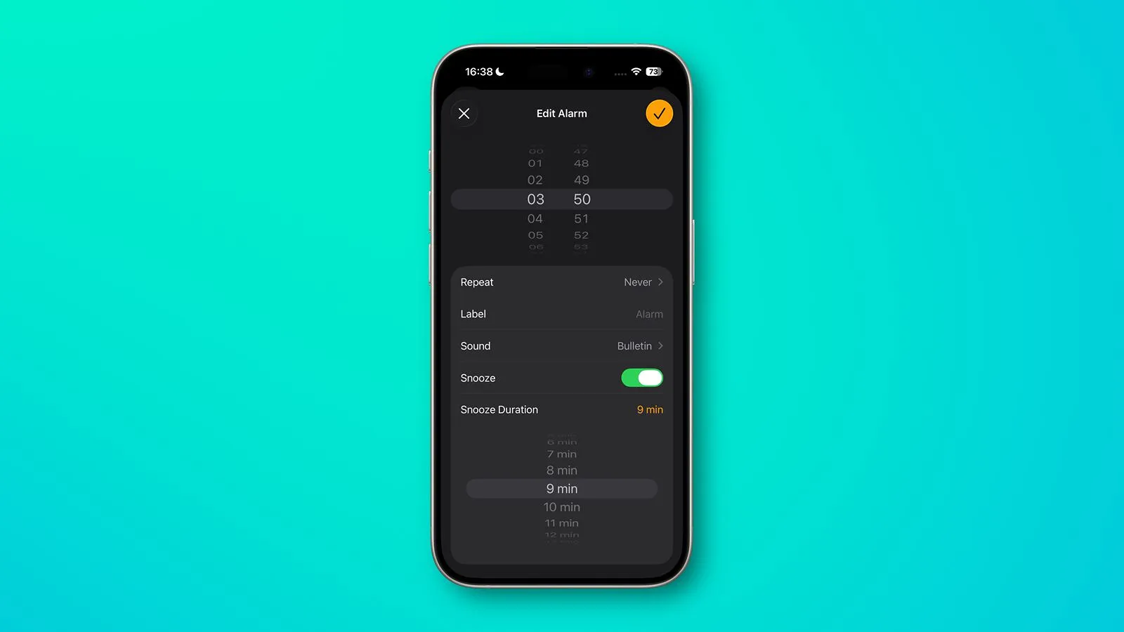 Bạn có thể chọn thời gian snooze từ 1 đến 15 phút khi đặt báo thức trong app Đồng Hồ, không còn bị cố định ở 9 phút.