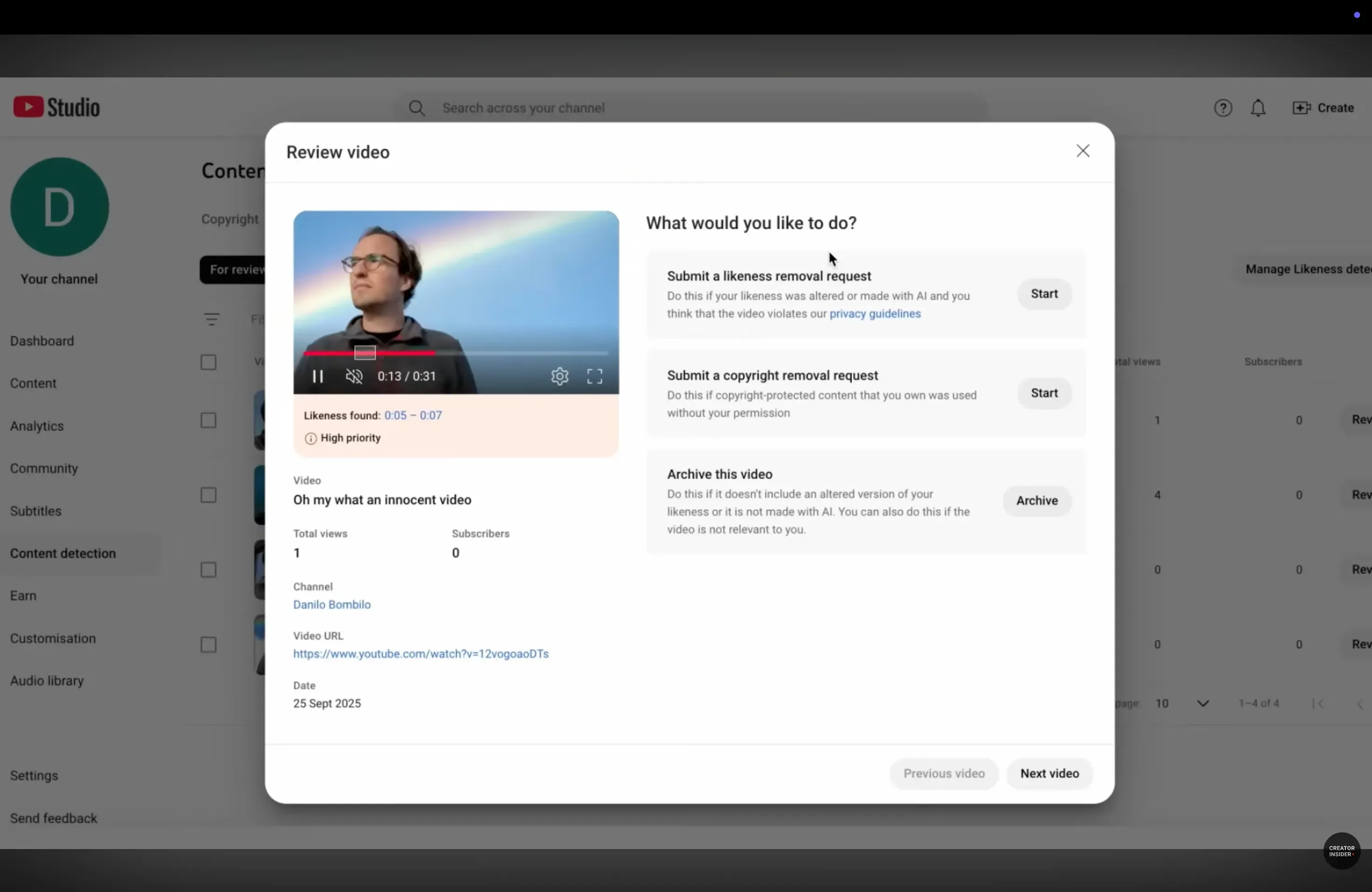 Bắt đầu từ hôm nay, các creator trong Chương trình Đối tác của YouTube sẽ có quyền truy cập vào tính năng phát hiện AI mới cho phép họ tìm và báo cáo các video tải lên trái phép sử dụng hình ảnh của mình. Như được thể hiện trong video này từ YouTube, sau khi xác minh danh tính, các creator có thể xem lại các video bị gắn cờ trong tab Phát hiện Nội dung trên YouTube Studio. Nếu một video trông giống nội dung được tạo bởi AI trái phép, các creator có thể gửi yêu cầu gỡ bỏ.